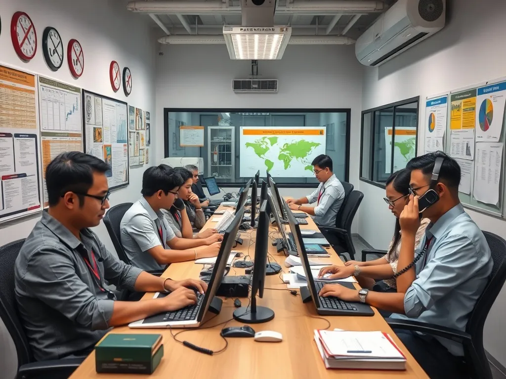 Four logistics professionals in a modern office discussing shipment documents with NNGGMY branding visible on a laptop.
